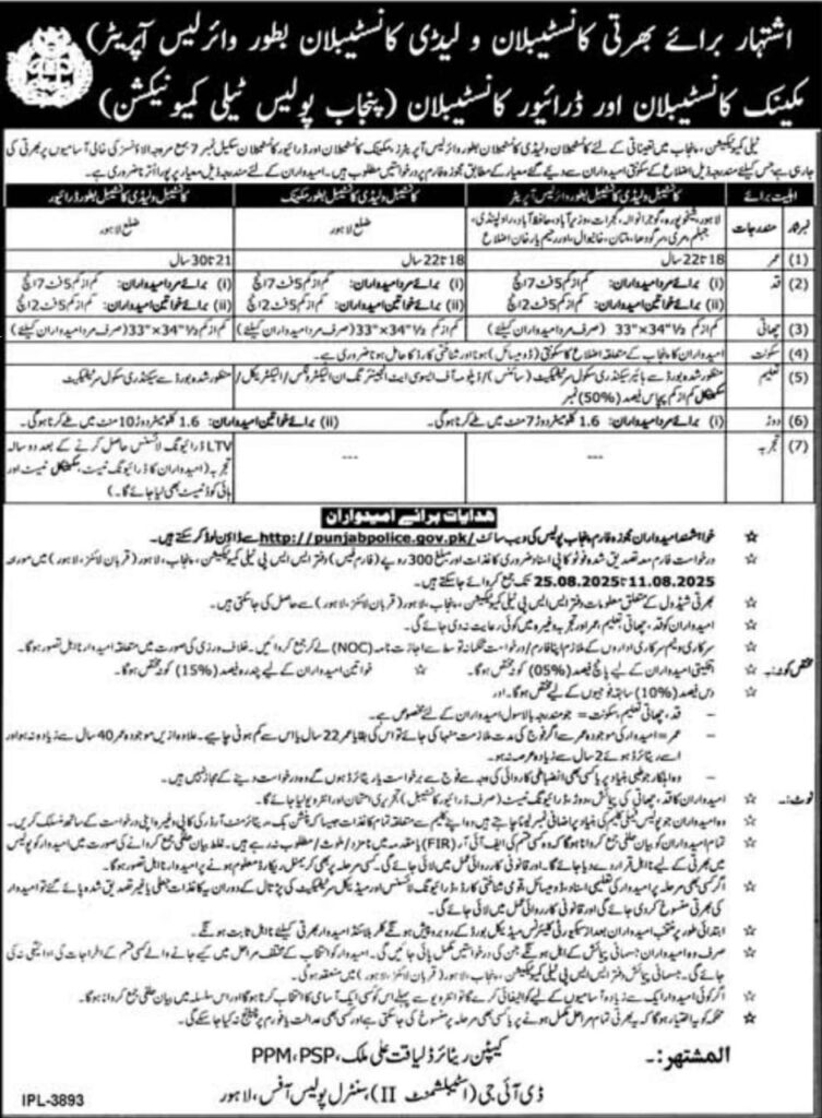 پنجاب پولیس بھرتی 2025 — کانسٹیبلز، لیڈی کانسٹیبلز، ڈرائیورز اور وارلیس آپریٹرز